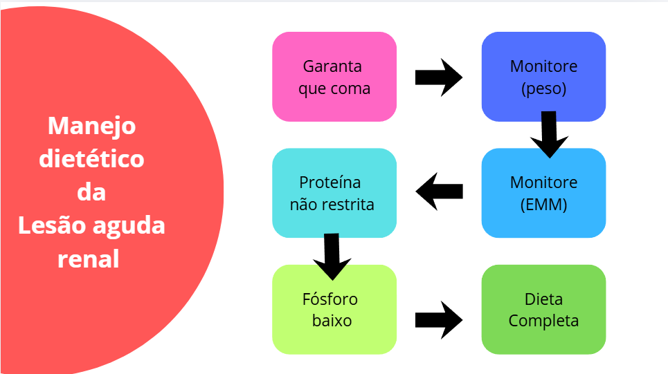 Como síntese da palestra, o especialista apresentou um fluxograma simplificado para o manejo dietético da lesão renal aguda, com a seguinte lógica: garantir que o animal coma, monitorar o peso, monitorar o escore de massa muscular, não restringir proteína, priorizar baixo fósforo e oferecer uma dieta completa.